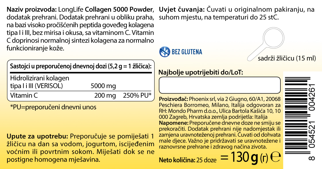 LongLife Collagen 5000 powder – radi se o inovativnoj formuli baziranoj na VERISOL®-u, sastojku prirodnog podrijetla koji sadrži bioaktivne peptide dobivene iz fibroblasta goveđeg podrijetla.