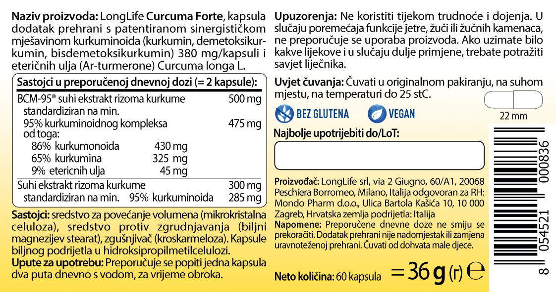 Curcuma Forte je posebno formuliran proizvod za maksimalnu iskoristivost kurkumina zbog prisutnosti BCM-95®, patentiranog 100% čistog ekstrakta koji kombinira kurkumin sa Ar-Turmerone, dragocjenim eteričnim uljem.