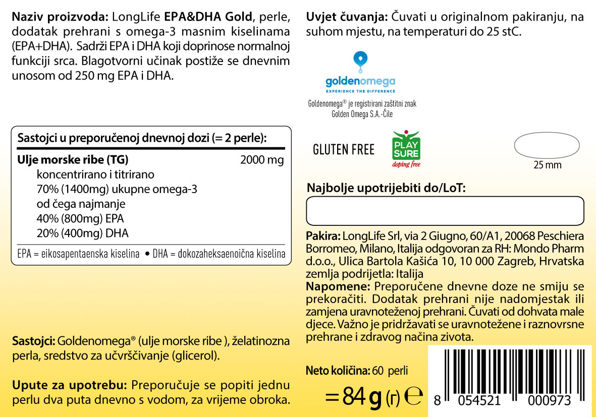 Proizvod EPA & DHA Gold dolazi u obliku perla koje sadrže morsko riblje ulje koje je bez mirisa i pročišćeno molekularnom destilacijom.