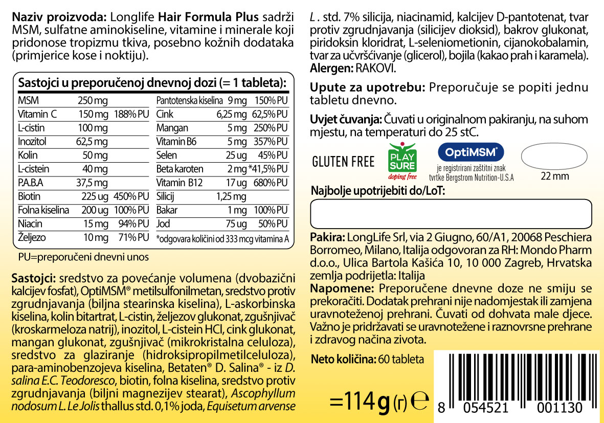 Hair Formula Plus sadrži OptiMSM™, registrirani zaštitni znak koji osigurava visoku koncentraciju i kvalitetu metilsulfonilmetana.