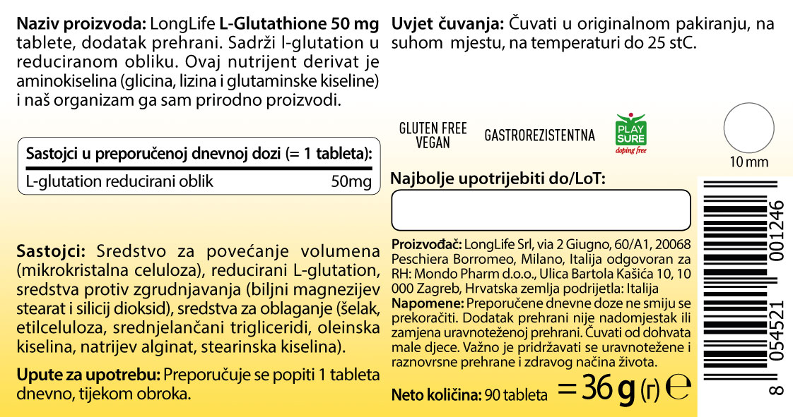 Sastojci: Punilo (mikrokristalna celuloza), reducirani L-glutation, sredstva protiv zgrudnjavanja (biljni magnezijev stearat i silicijev dioksid), sredstva za glaziranje (šljaka, hidroksipropilmetilceluloza, talk i polietilen glikol), boja (titanijev dioksid).
