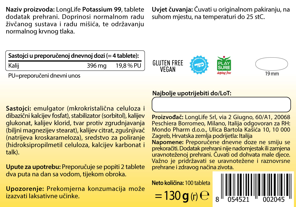 Sastojci: sredstvo za povećanje volumena (mikrokristalna celuloza), stabilizator (sorbitol), sredstvo za povećanje volumena (dvobazni kalcijev fosfat), kalijev glukonat, kalijev klorid, sredstvo protiv zgrušavanja (biljni magnezijev stearat), kalijev citrat, zgušnjivač (natrijeva karboksil-celuloza) hidroksipropil celuloza, hidroksipropil metil celuloza, kalcijev karbonat i talk).
