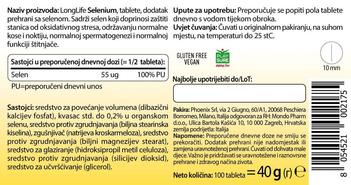 Sastojci: sredstvo za povećanje volumena (dvobazni kalcijev fosfat), zajamčeni sadržaj kvasca (0,1%) u organskom selenu, sredstvo protiv zgrudnjavanja (stearinska kiselina), zgušnjivač (natrijeva karboksimetilceluloza), sredstva protiv zgrušavanja (biljni magnezijev stearat i silicij dioksid) , sredstvo za glaziranje (hidroksipropil metil celuloza), sredstvo za učvršćivanje (glicerol).
